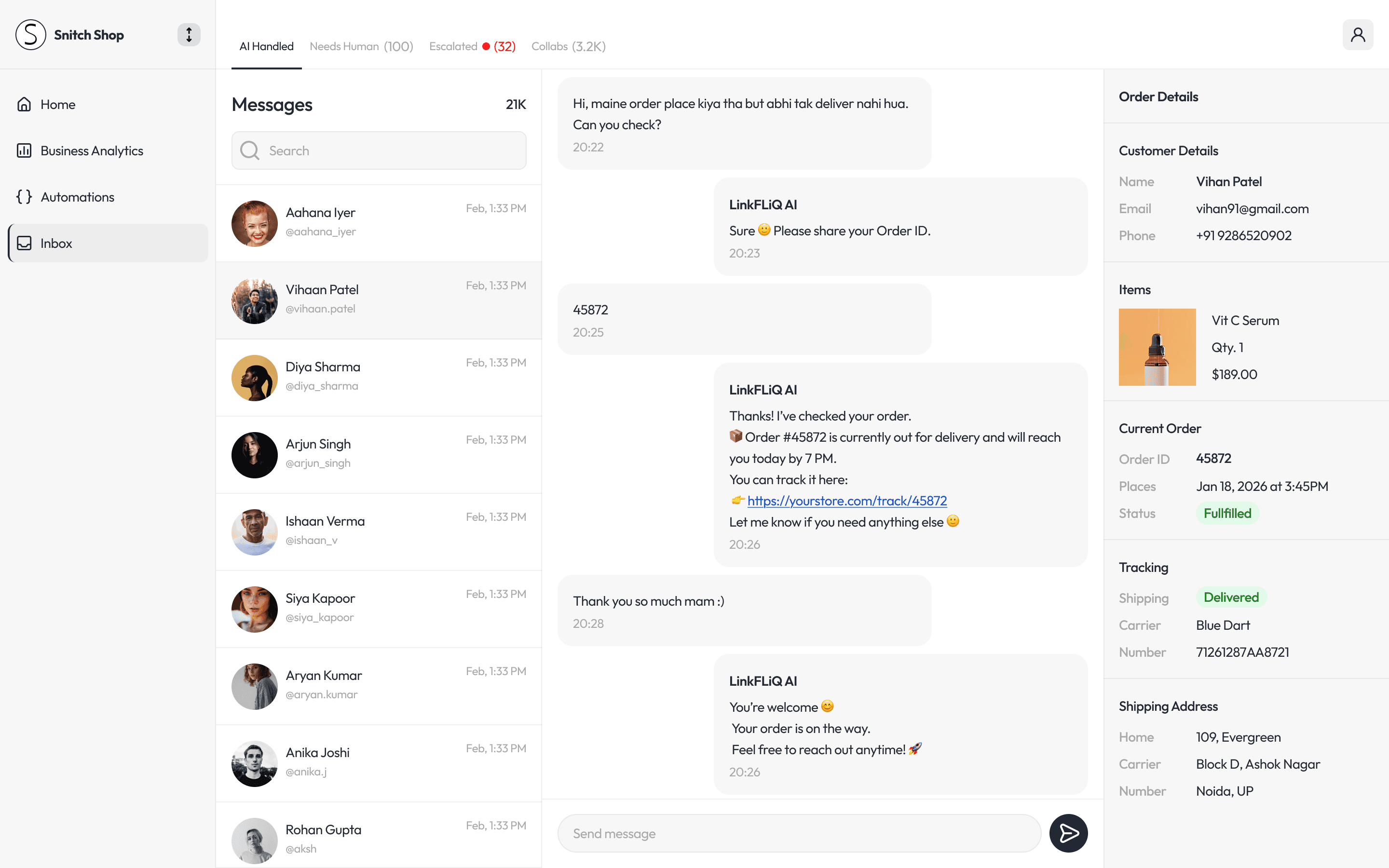 Live catalog. Real orders. Actual stock levels. LinkFliQ pulls your store data and responds like someone who knows your business inside out.